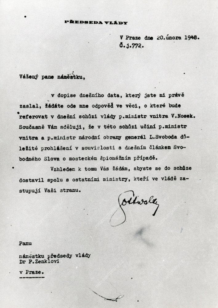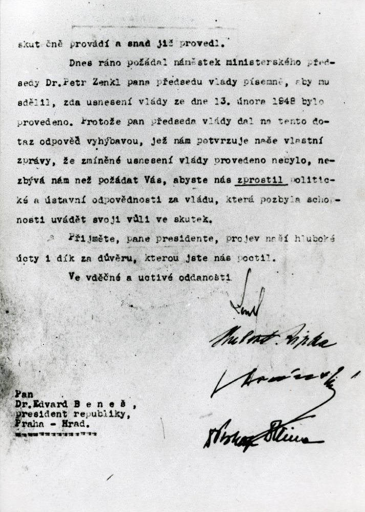 A letter of Klement Gottwald to Petr Zenkl in which the Prime Minister invites him to the government session. Text reproduction, 20 February 1948. MMP H 198 576; Reproduction of the resignations of the ministers Petr Zenkl, Hubert Ripka, Jaroslav Stránský, and Prokop Drtina addressed to Edvard Beneš. Text reproduction, 20 February 1948. MMP H 198 577.