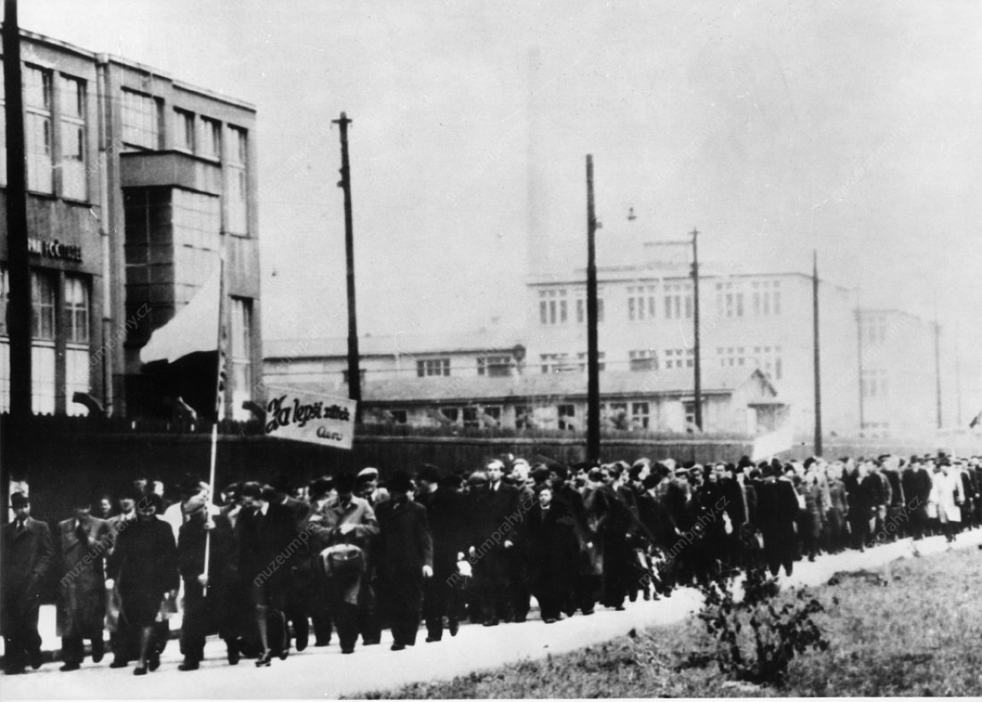The morning in the Aero Letňany enterprise – the employees are leaving for the demonstration in Old Town Square. 21 February 1948, MMP H 198 578; Selected snapshots of processions heading for Old Town Square. 21 February 1948, MMP H 044.098/010 and H 200 247/003.