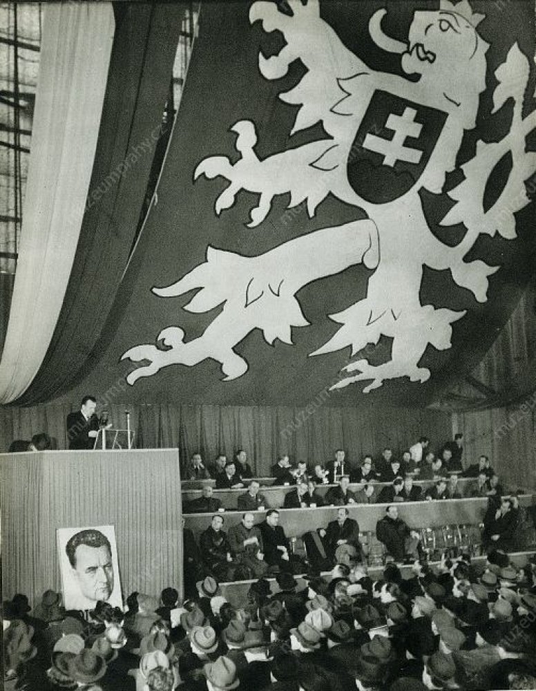 The congress of works committees in the Industrial Palace in Prague. Image of the main stand during the speech of Antonín Zápotocký, deputy and chairman of the Central Trade Union Council. 22 February 1948, MMP HNS 000 263/060.