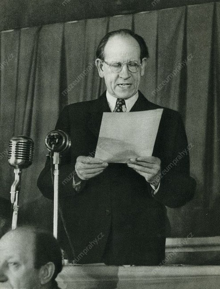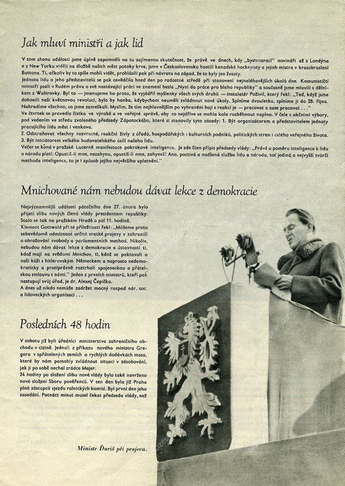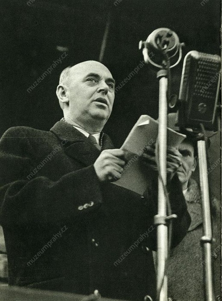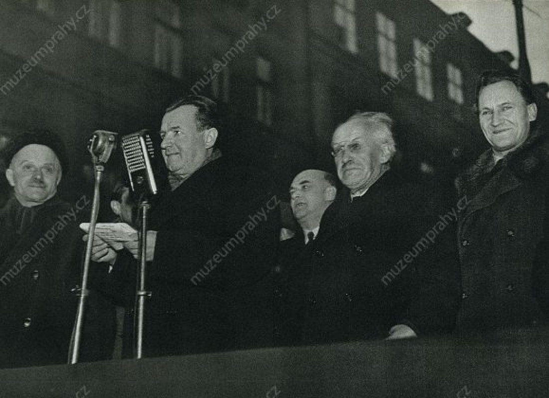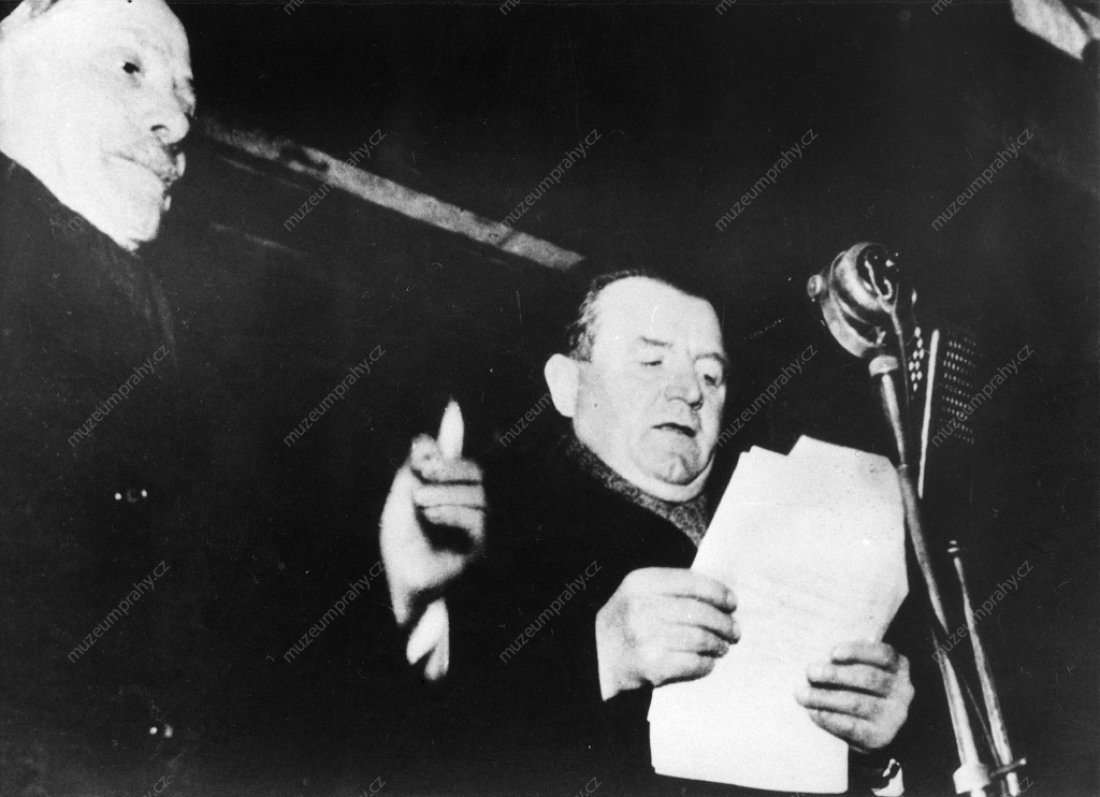 Prime Minister Klement Gottwald informs the public that President Edvard Beneš accepted the resignations of non-communist ministers. 25 February 1948, MMP H 198 751; In the presence of his party co-members, Prime Minister Klement Gottwald informs the crowd about the results of his meeting with President Edvard Beneš, MMP H 044 098/035.