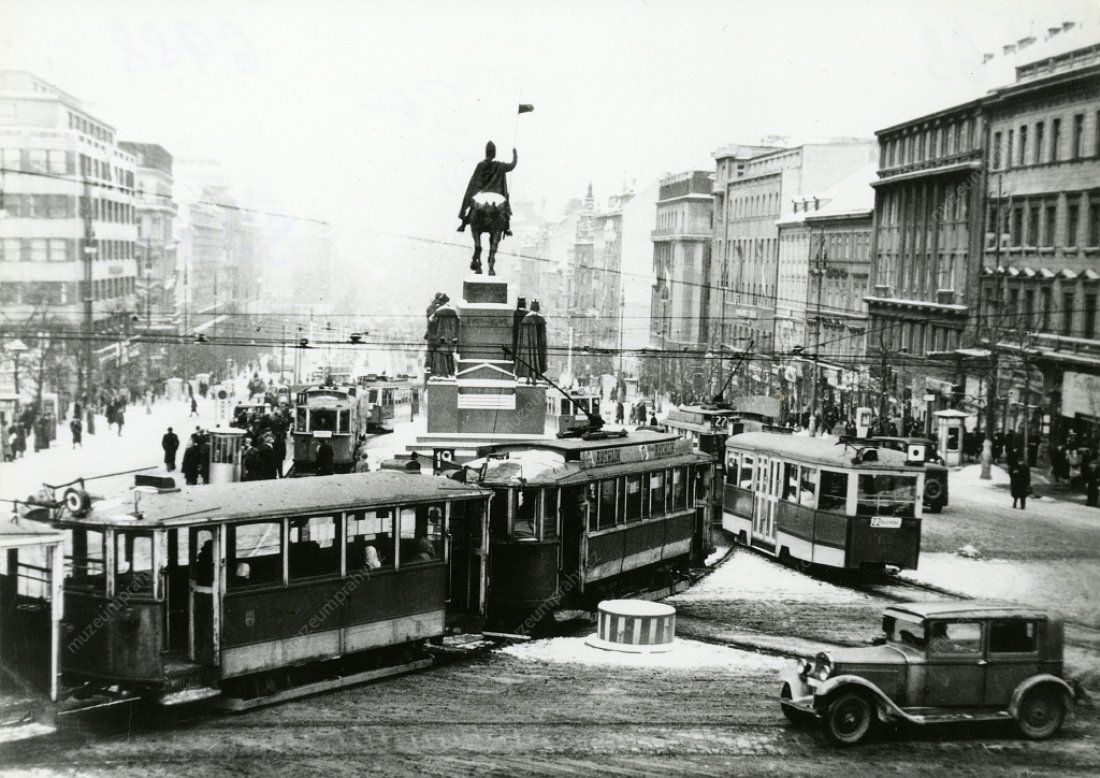 Title page of Rudé právo newspaper on 25 February 1948 bringing information about the national general strike, MMP HNS 000 102/061; Old Wenceslas Square at noon on 24 February 1948. All transportation was ceased for an hour during the strike, MMP H 119 546.