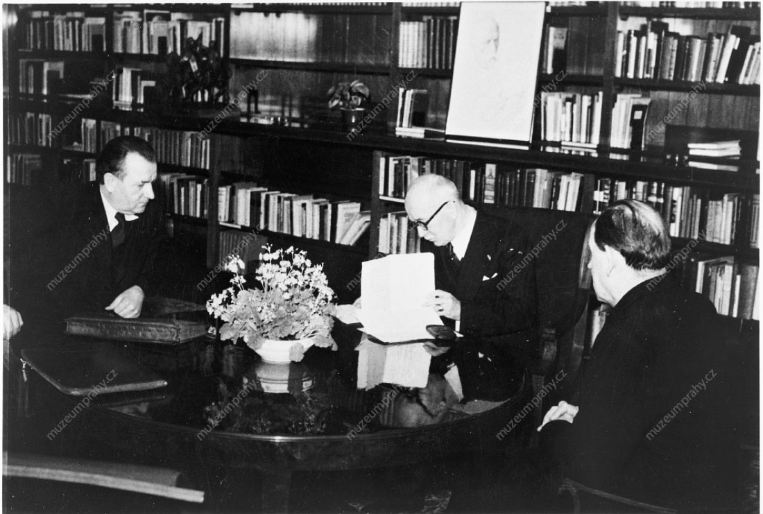 Negotiating the proposed resignations of the non-communists at the round table in the president’s office at Prague Castle. From left: Edvard Beneš, Antonín Zápotocký, Klement Gottwald, Václav Nosek, MMP H 240 247; PPrime Minister Klement Gottwald and President Edvard Beneš having signed the resignations of non-communist ministers, MMP H 200 247/021.