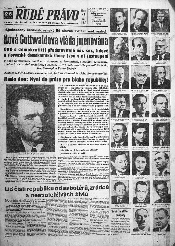 Rudé právo newspaper on 26 February 1948. The title page with the list of the new government members, MMP HNS 000 103/061; Prime Minister Klement Gottwald and the General Secretary of the Communist Party of Czechoslovakia, Rudolf Slánský, approach the crowd, MMP H 044 098/034.