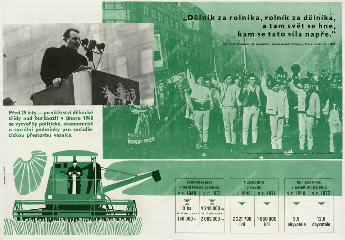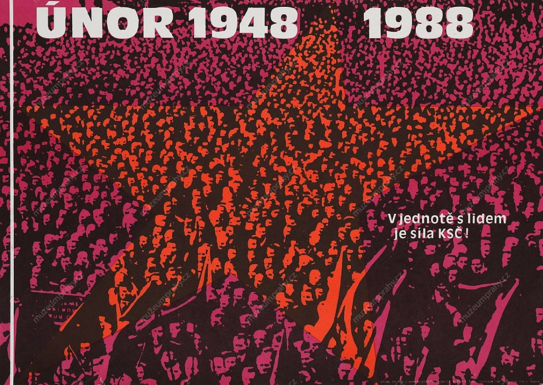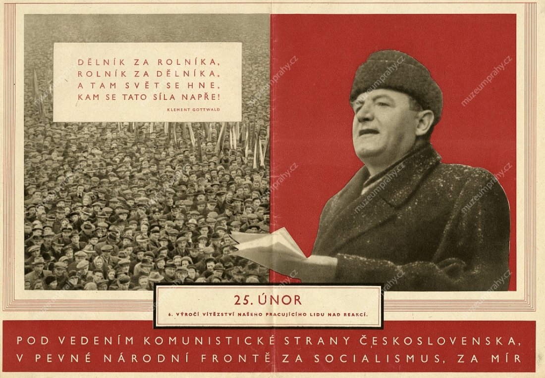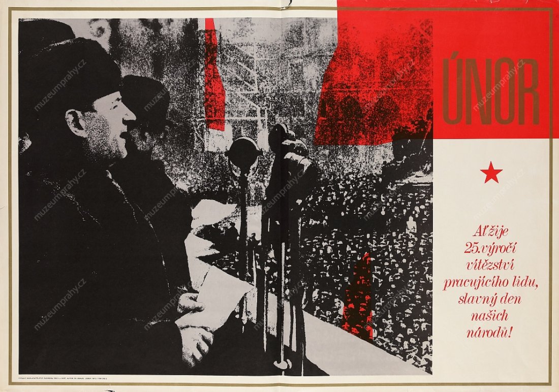 Propaganda poster published for the 6th anniversary of Victorious February (1948–1954), MMP H 200 100/010; Poster for the 25th anniversary using a photomontage from the speech of Klement Gottwald in Old Town Square in Prague on 21 February 1948. Created by Fr. Kraus. Published by Svoboda for ÚV KSČ, 1973. Printed by SG 2, MMP H 088 949.