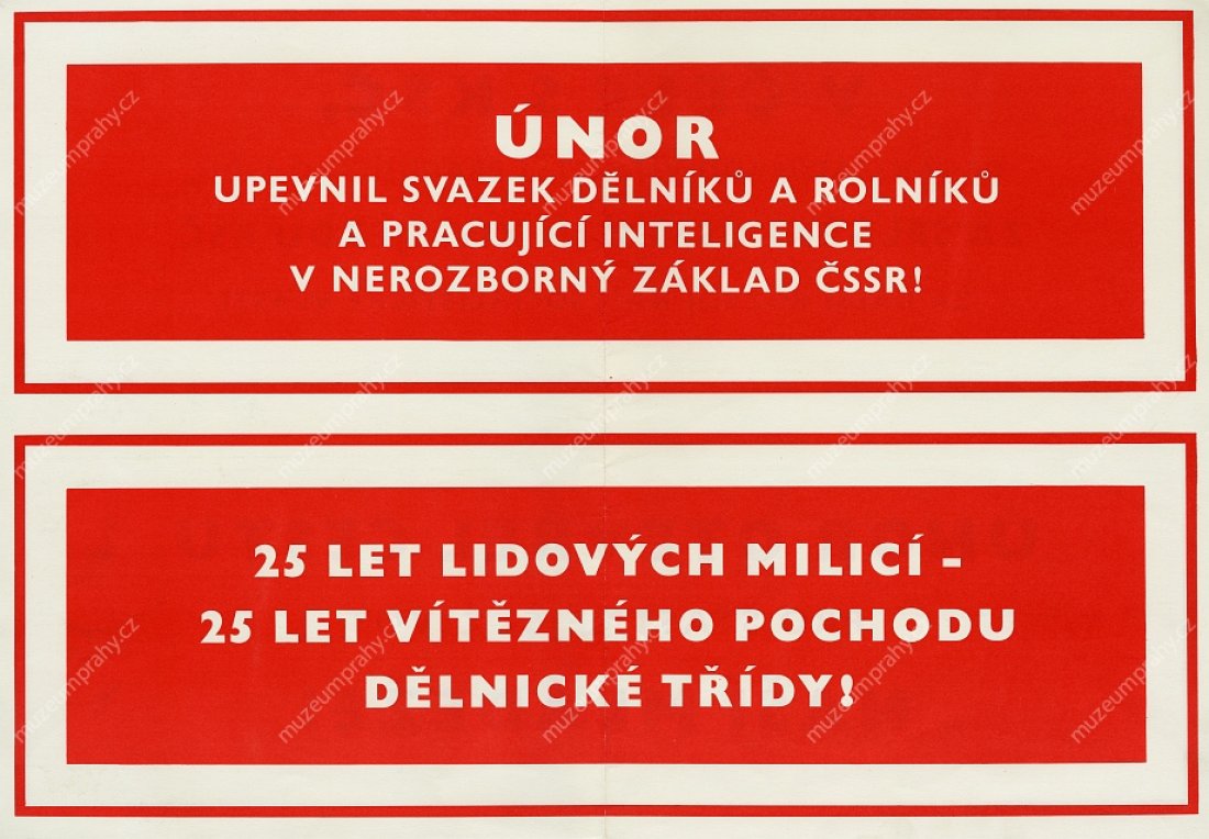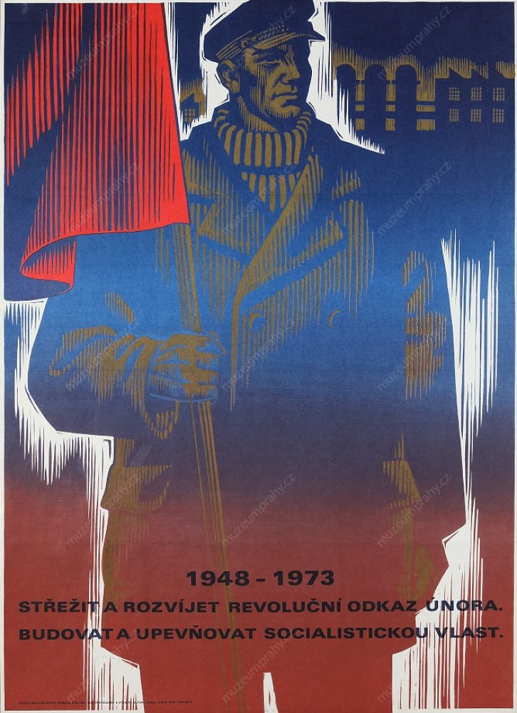 Poster for the 25th anniversary of Victorious February (1948–1973) with a quote from Klement Gottwald’s speech (text in the white field). Created by P. Matoušek,1973, Pardubice, MMP H 088 943/001.