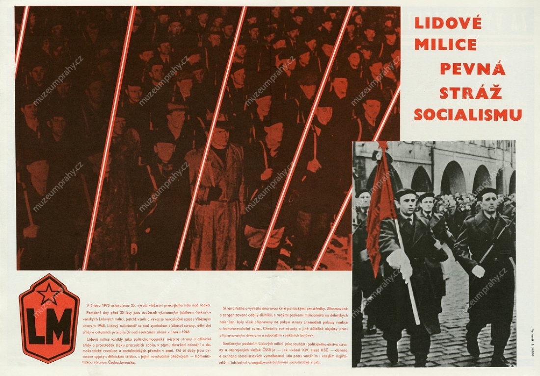 Poster for the 25th anniversary. Created by J. Lidral. Published by Svoboda. Printed by SG 2, MMP H 088 946; Poster for the 25th anniversary. Motto: People’s Militias – Firm Guards of Socialism. Created by Z. Filip, MMP H 091 120/011.