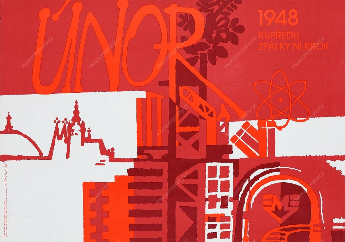 Poster February 1948. Forward, not a step backwards! From the collection of communist posters 1945–1948 published by the Central Committee of the Communist Party of Czechoslovakia and the Museum of Klement Gottwald in 1978. Printed by Severografia Děčín, created by A. Zábranský, MMP H 118 061; Poster for the 36th anniversary of Victorious February (1948–1984). Created by J. Lidral. Pardubice, MMP H 129 672.