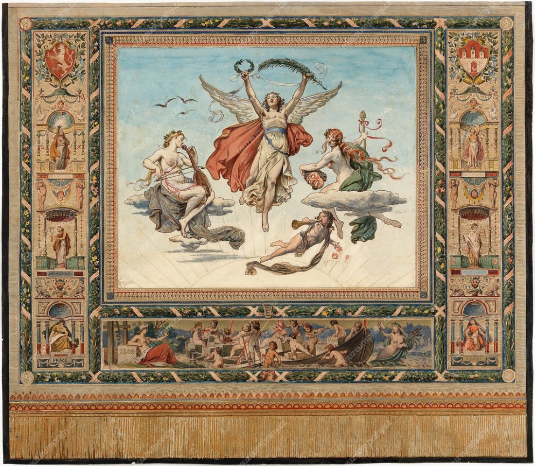 Návrh opony pro Národní divadlo od malíře Františka Ženíška (1849–1916), součást velkého souboru děl různých umělců vzniklých jako návrhy výzdoby Zlaté kapličky. Soubor se stal součástí muzejních sbírek záhy po proběhnutí soutěže o výzdobu Národního divadla MMP H 2 280.