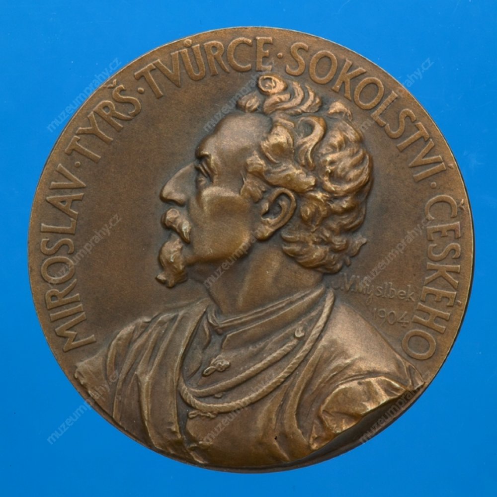 Miroslav Tyrš (1832–1884), medaile z dílny Josefa Myslbeka na počest zakladatele českého Sokola, 1904, MMP H 55 580.