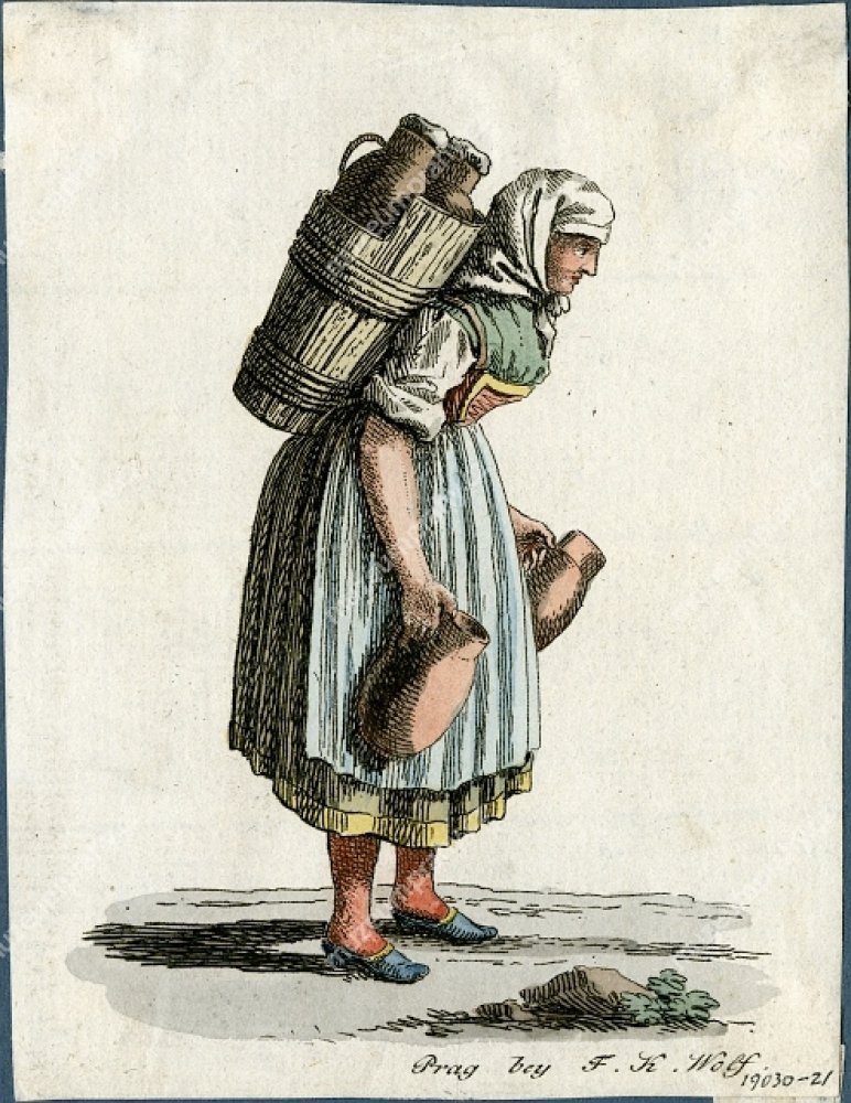 Mlékařka na kolorované mědirytině z cyklu Pražské typy, přelom 18. a 19. stol., autor František Karel Wolf (1764–1836), MMP H 019.030/021; Pohled na Malostranské mostecké věže z Karlova mostu, vpředu vlevo mlékařka a vůz tažený psem, olej na plátně, autor Albert Schmidt, 1870, MMP H 033 484.