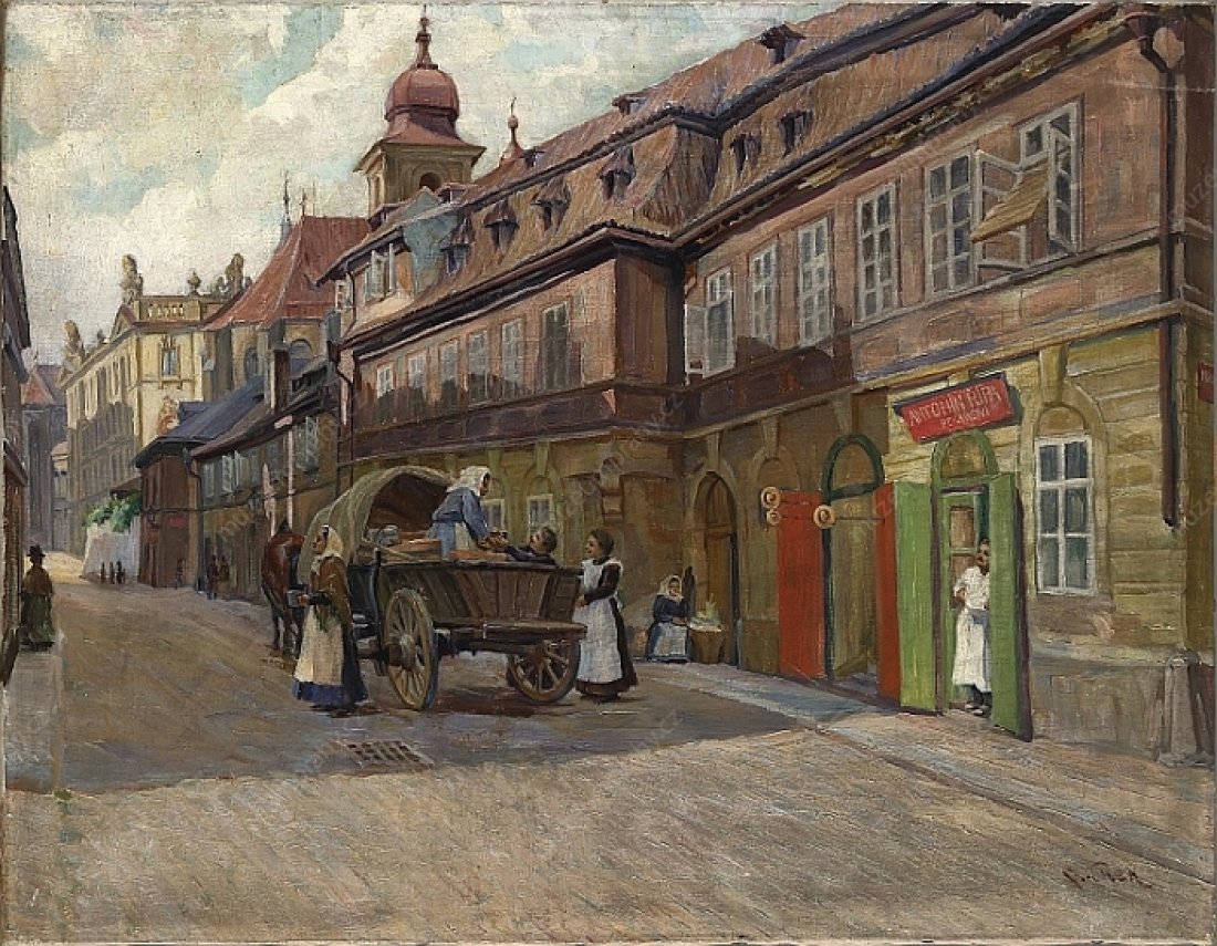 Rozvoz mléka v Dušní ulici zachycený na dobové malbě z 90. let 19. stol., autor Oscar Rex (26. 3. 1857 – 8. 2. 1929), olej na plátně, MMP H 044.124.