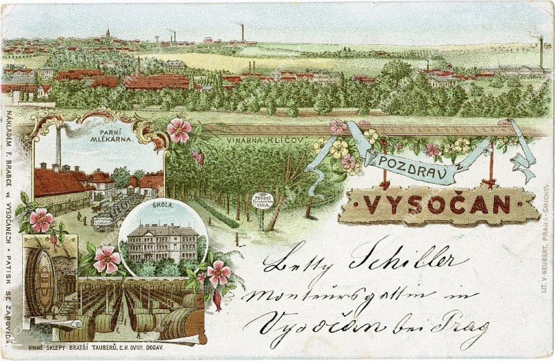 Parní mlékárna na pohlednici s litografií panoramatického vyobrazení Vysočan z roku 1898, autor V. Neubert, Praha-Smíchov, MMP H 299 817.