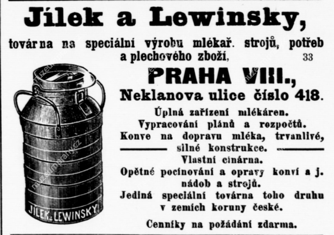 Inzerát na výrobní sortiment pražské firmy Jílek a Lewinsky. Zemědělské listy 22, 28. 4. 1905.