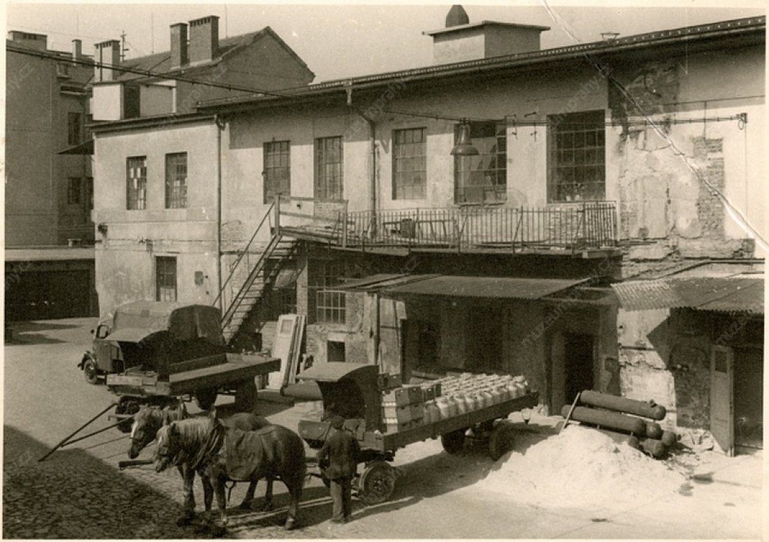 Fotografický snímek s pohledem na nádvoří Vysočanské mlékárny, z období mezi léty 1945–1947, MMP H 206 136; Pohled na venkovský povoz přivážející konve s mlékem do První české akciové mlékárny v Nuslích. Foto Jiří Freund, reprint Český svět 26, 1909, foto Jiří Freund, MMP.
