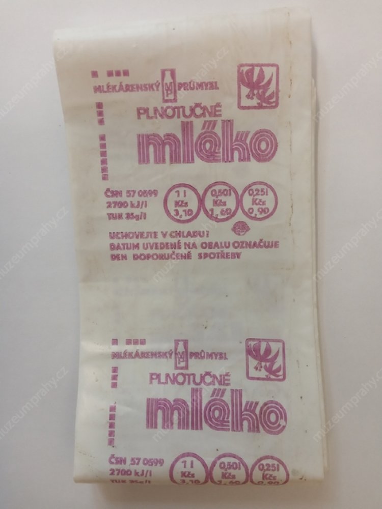Polyethylenový obal od polotučného mléka Mlékárenského průmyslu, n. p., výrobce obalu v.d. Směr, 1. pol. 80. let 20. stol., MMP H 339 538; Polyethylenový polotovar používaný při balení mléka v továrním balícím stroji. Logo výrobku – plnotučné mléko Mlékárenského průmyslu, n.p., výrobce obalu v.d. Směr, 1. pol. 80. let 20. stol., MMP H 329 192.