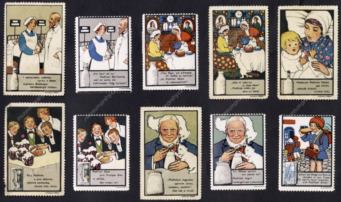 Soubor reklamních nálepek se slogany propagujícími výrobky Radlické mlékárny, sign. M. Schulz, poč. 20. stol., MMP H 204 921–930.