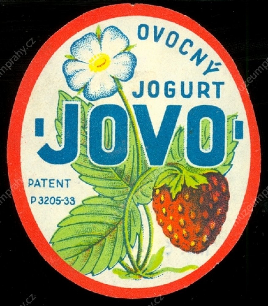 Reklamní nálepky od ovocného jogurtu Radlické mlékárny, 30. léta 20. stol., MMP H 143 054–56. Nově používaný ovocný džem s jahodovou či meruňkovou příchutí měl omezit kyselost jogurtu a zamezit vzniku plísní. Mlékárna si nechala tento výrobek z roku 1933 patentovat a jeho licenci převzaly další podniky v 15 zemích Evropy. Od roku 1934 se po zavedení pasterace začala džemová vrstva dávat na dno jogurtových sklenic.