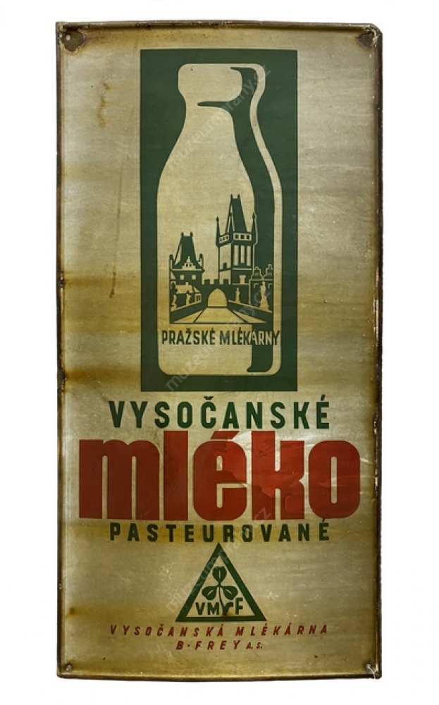 Reklamní vývěsní cedule z prodejny Vysočanské mlékárny B. Frey, a.s, tisk na plechu, 30. léta 20. stol., MMP H 339 406.