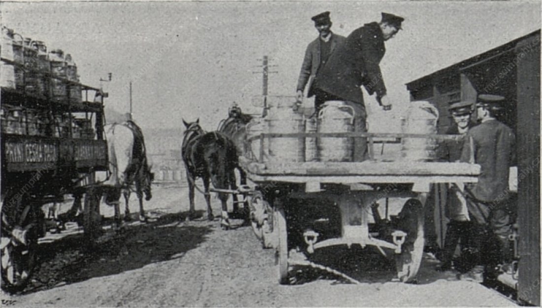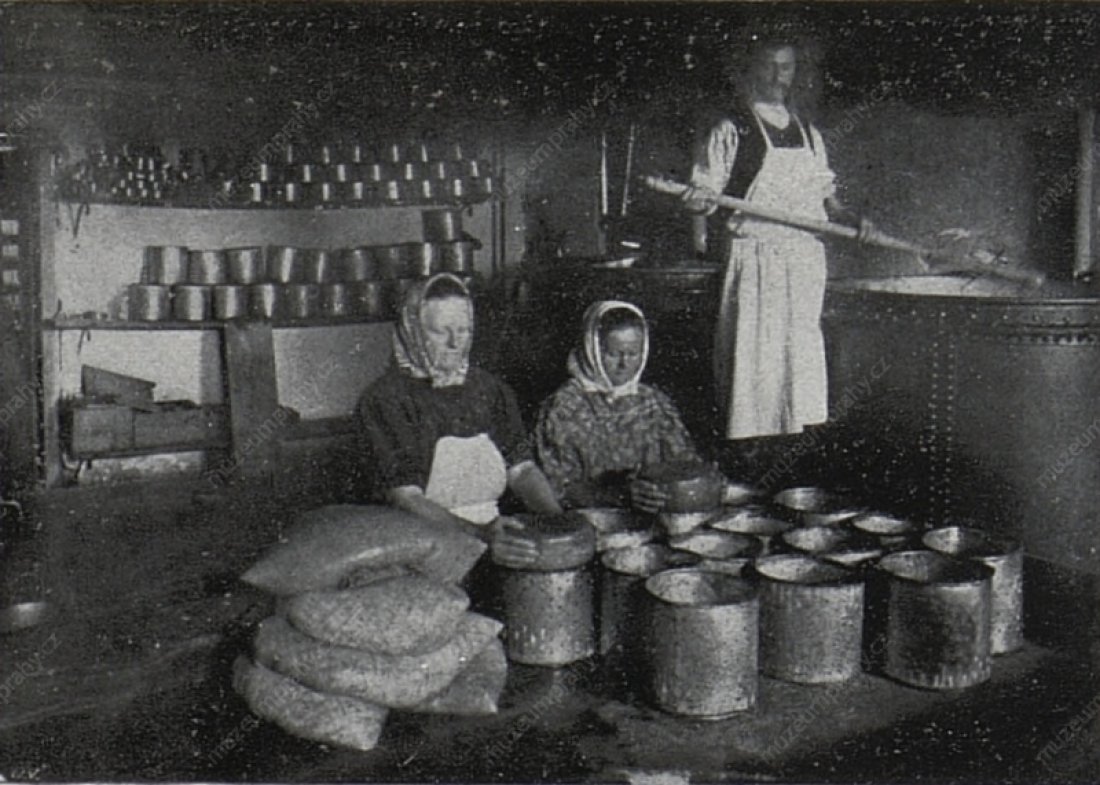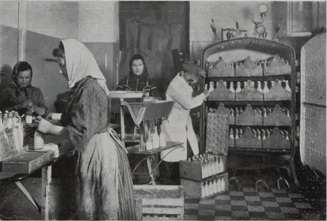 Vykládání mléka dovezeného z venkovských dvorů, foto Jiří Freund, kolem roku 1908–1909, reprint Český svět 26, 1909, MMP; Výroba tzv. Backhausova dětského mléka. Ošetření mléka spočívalo v ohřívání při teplotě 103 stupňů po dobu 15 minut, k čemuž sloužila ohřevná skříňka vpravo. Foto Jiří Freund, kolem roku 1908–1909, reprint Český svět 26, 1909, MMP.