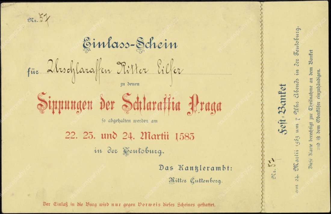 Vstupenka na banket a další akce konané v rámci 2. schlaraffského koncilu v Praze ve dnech 22.–24. 3. 1583 (1883) pro rytíře Gottholda der Eilfer (redaktor Carl Tobisch). MMP H 041 320