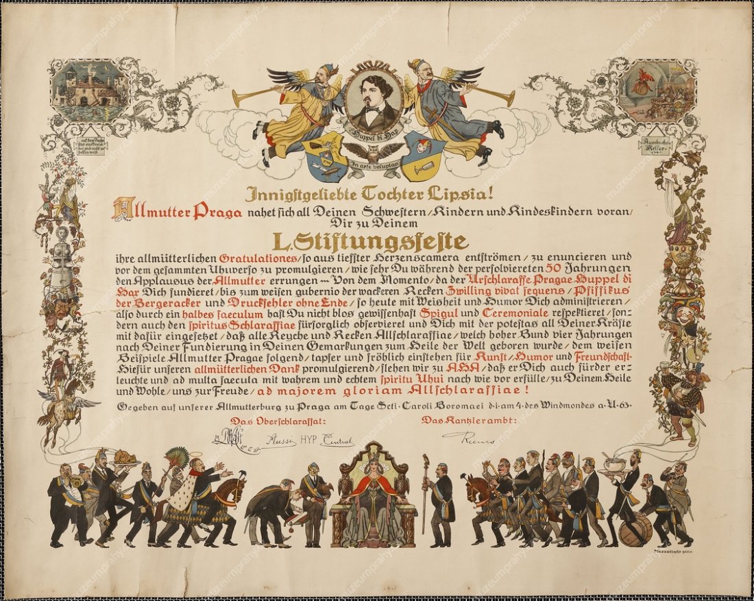 Blahopřejný list pražské Schlaraffie adresovaný Schlaraffii lipské u příležitosti 50. výročí jejího založení, litografie, autor rytíř Mezzotinto der Geschabte (Jiří Jilovský), 4. 11. 1922. MMP HD 002 463