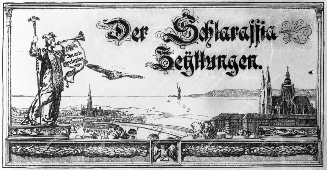 Záhlaví spolkového časopisu Schlaraffia Zeyttungen, vlevo alegorická postava, symboly Vídně, Prahy a sochy Svobody v pozadí, 30. léta 20. století, MMP HNX 000 992/001