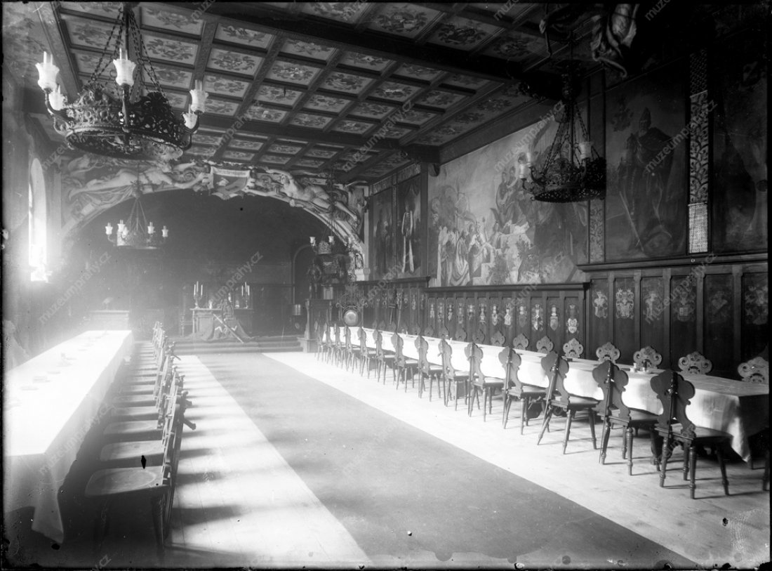 Spolková místnost ve Štěpánské ulici před rokem 1914. Schlaraffové měli zařízenou část lokálu jako svůj hrad, vyzdobený po způsobu rytířských sálů. Na stěnách visely stylizované obrazy zakladatelů Schlaraffie i znaky jednotlivých rytířů pražské říše. V ústřední části na vyvýšeném stupínku sedávali tři vrchní schlaraffové. Nad jejich hlavami bděl rozkřídlený výr, moudrý Uhu, erbovní zvíře, hlavní symbol a ochránce všech schlaraffů. V čele vyvýšeného podia byl umístěn znak pražské Schlaraffie v polceném modrožlutém štítě s heslem spolku „In arte voluptas“ (V umění je rozkoš). Kazetový strop pak zdobily znaky jednotlivých říší – odnoží pražské matky. MMP HNX 001 277