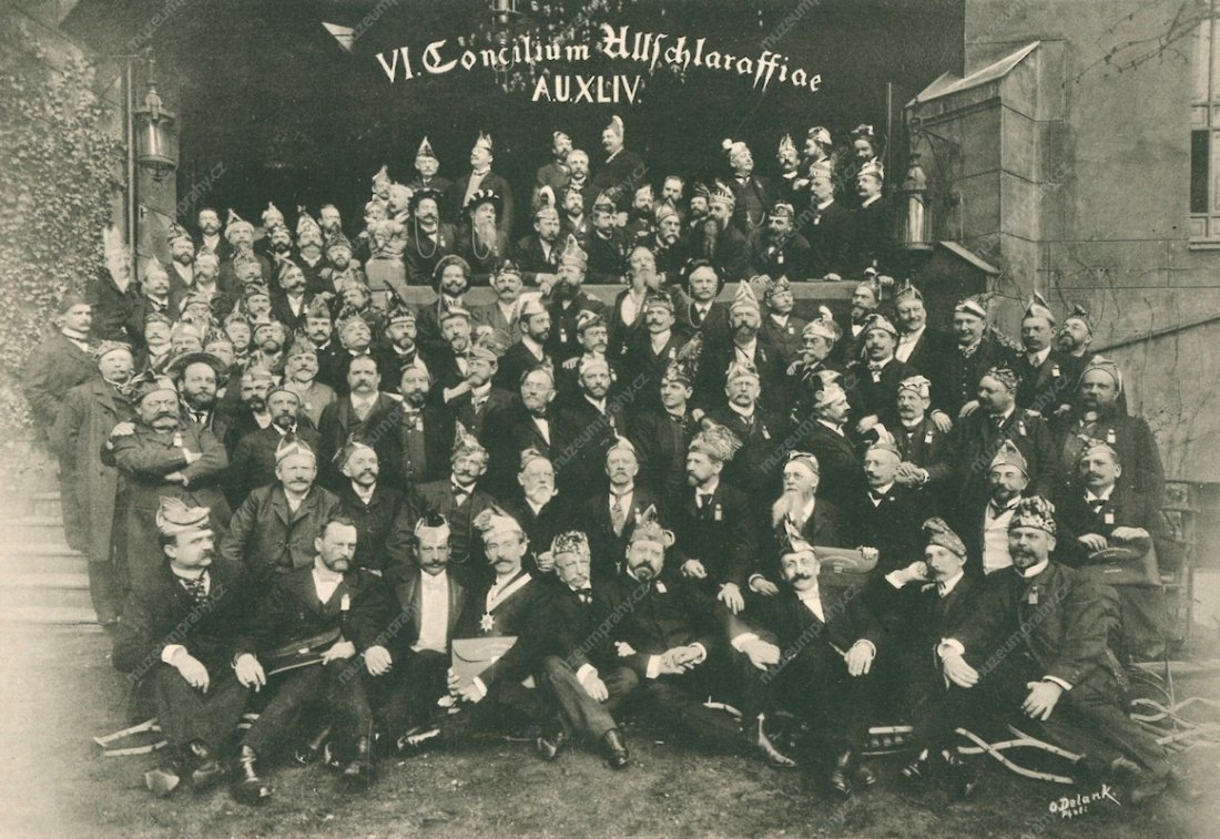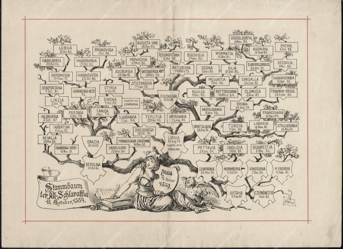 Rodokmen Schlaraffie, otištěno v Der Schlaraffia Zeyttungen 10. 10. 1584 (1884). Pražská Schlaraffia stála od roku 1876 v čele všeschlaraffského hnutí, tehdy jednotlivé odnože, zvané říše (Reyche), sjednotily své předpisy a vytvořily propojenou síť, která původní pražské recesi otevřela cestu k celosvětovému hnutí. Strom života zobrazuje jednotlivé schlaraffské říše, vyrůstající ze společného kmene pražské matky. MMP H 041 311_002/008; Legáti VI. schlaraffského koncilu v Berlíně, A.U. 44 (1903), foto O. Delank. Schlaraffové užívali svůj vlastní letopočet. Označení A.U. – Anno Uhui znamená rok výra, pomyslným rokem nula v jejich datování se stal rok založení pražské Schlaraffie (1859). Od té doby se počíná nový schlaraffský letopočet, platný do dnešních dnů.