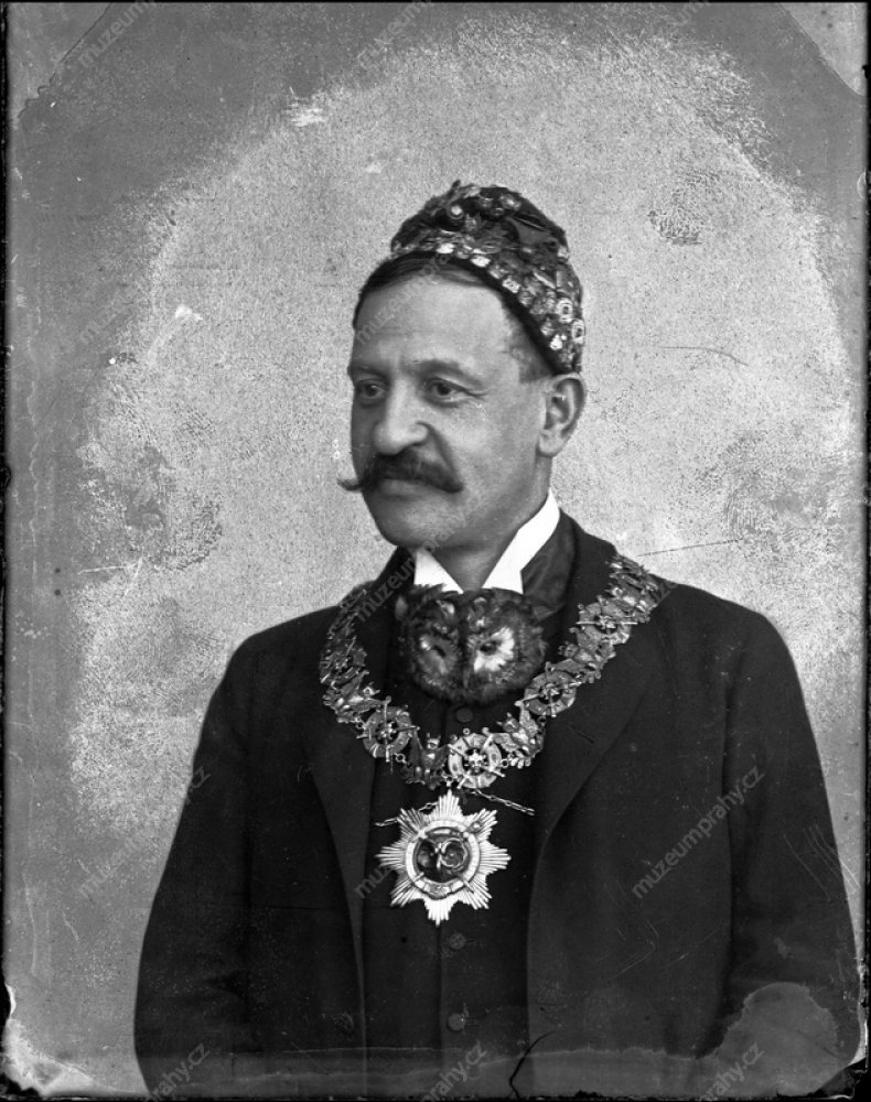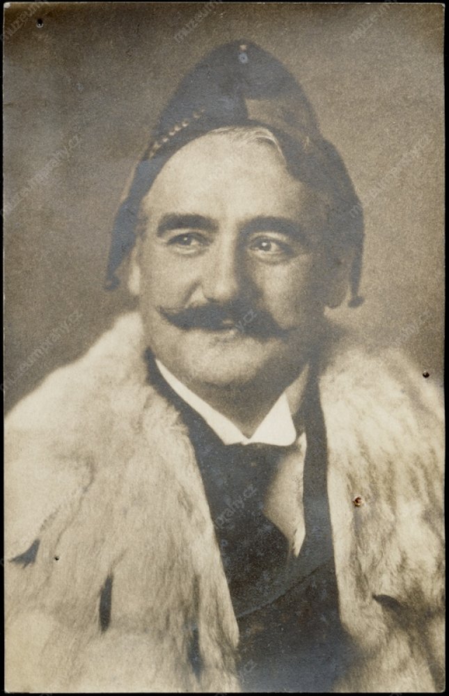 Vrchní pražský schlaraff rytíř Devast vom Böhmerwalde (Ničitel z Českého lesa), občanským jménem Felix Lechner (do r. 1902 Löwy), komerční rada a obchodník s kulatinou a řezivem, před 1914. MMP HNN 015 500; Podobenka rytíře Aussi mit die tiefen Zähn (Aussi s vykotlanými zuby), civilním jménem Dr. Alfred Soyka, zubní lékař. MMP HD 002 461/004