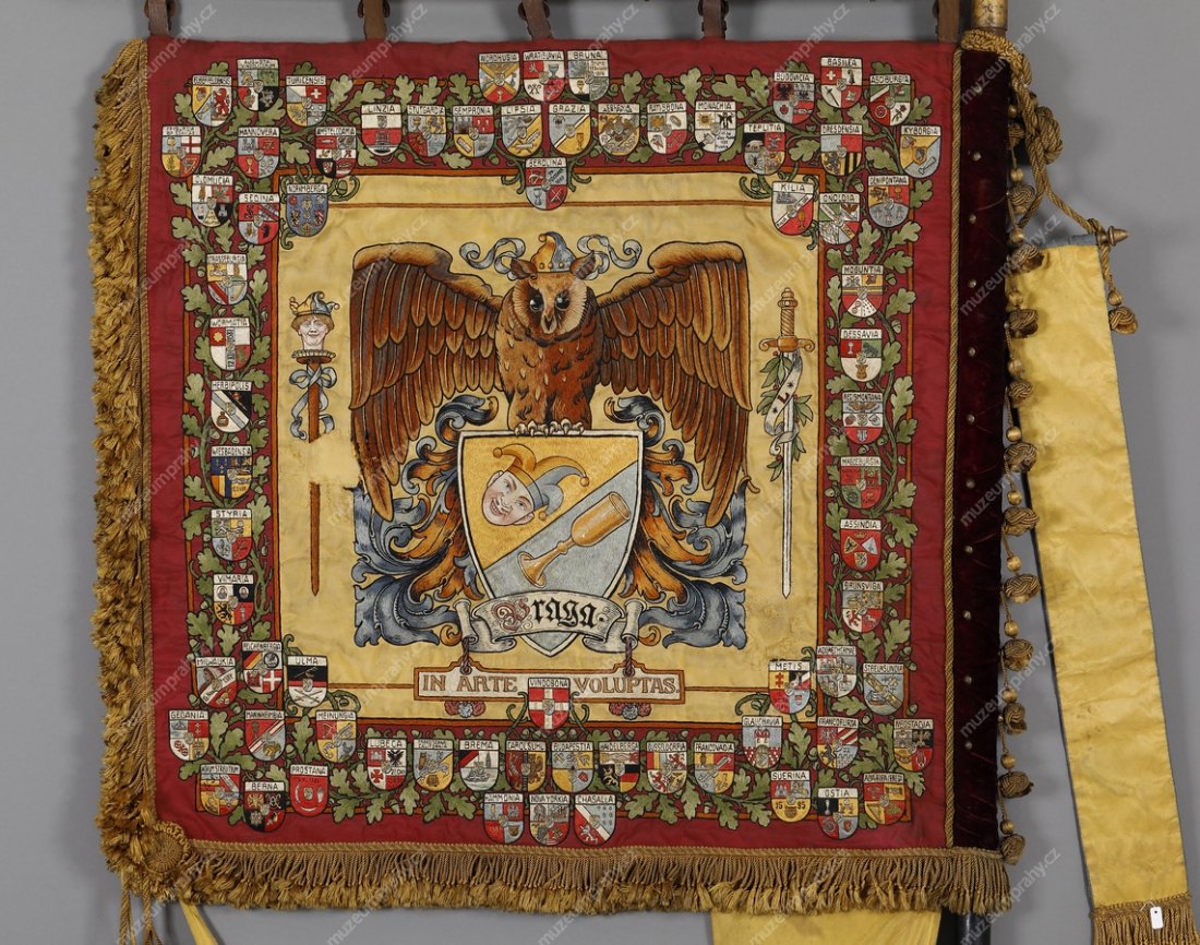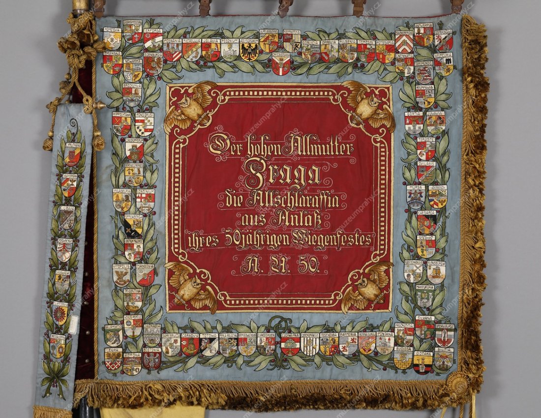 Korouhev z moaré hedvábí schlaraffské pražské Všemáti (Allmutter Praga), vyšívaná. Líc: znak Allmutter Praga, po okraji znaky odnoží Allschlaraffie. Rub: v ozdobném rámci vyšitý nápis „Der hohen Allmutter Praga die Allschlaraffia aus Anlass ihres 50jährigen Wiegenfestes A.U. 50" (Velké Všemáti Praze Allschlaraffia u příležitost 50. výročí jejího zrodu A.U. 50), po okraji znaky odnoží Allschlaraffie. Součástí kovová litá žerď, završená figurou sovy a opatřená ramenem k zavěšení korouhve, 1909. MMP HD 002 444/002 a/008