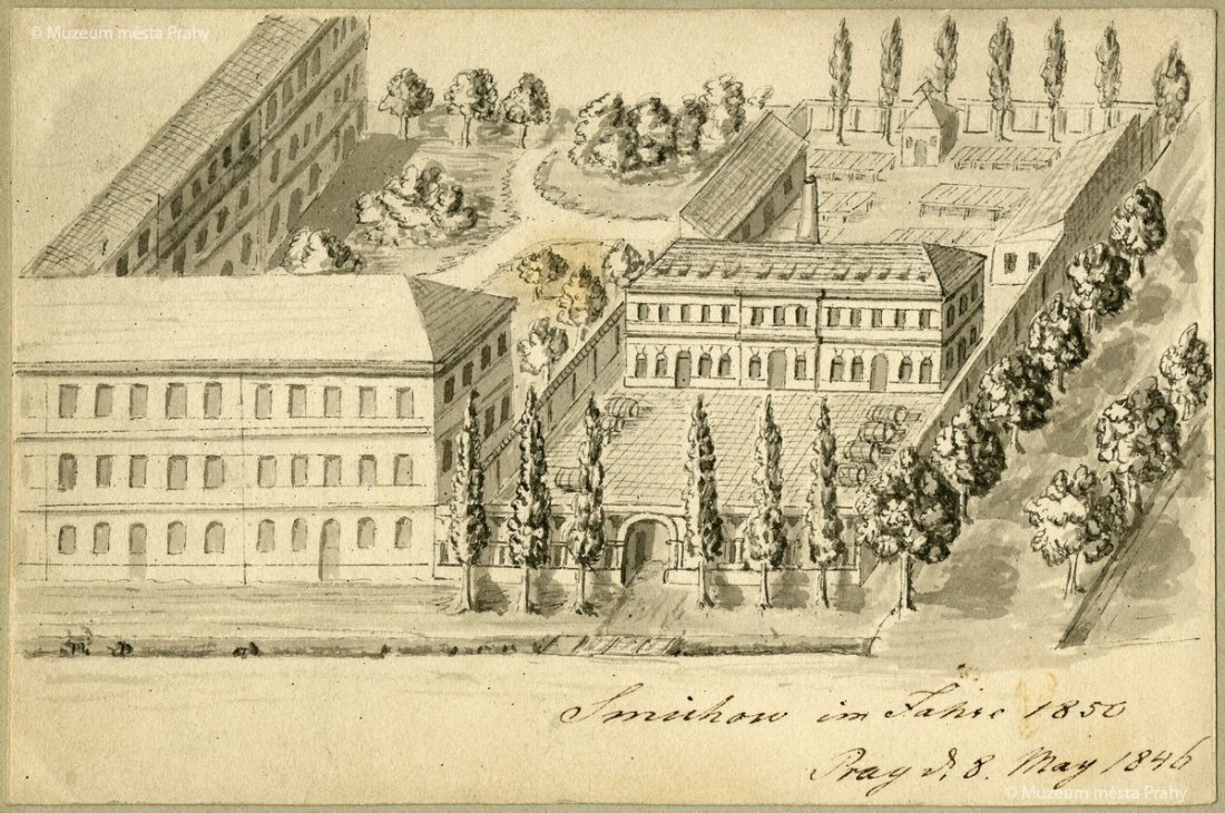 Lístek do památníku – kresba představující ideální podobu areálu smíchovské porcelánky, datováno 8. květnem 1846, lavírovaná tušová perokresba, 8,8 × 13,3 cm, sbírka MMP, inv. číslo H 036 117