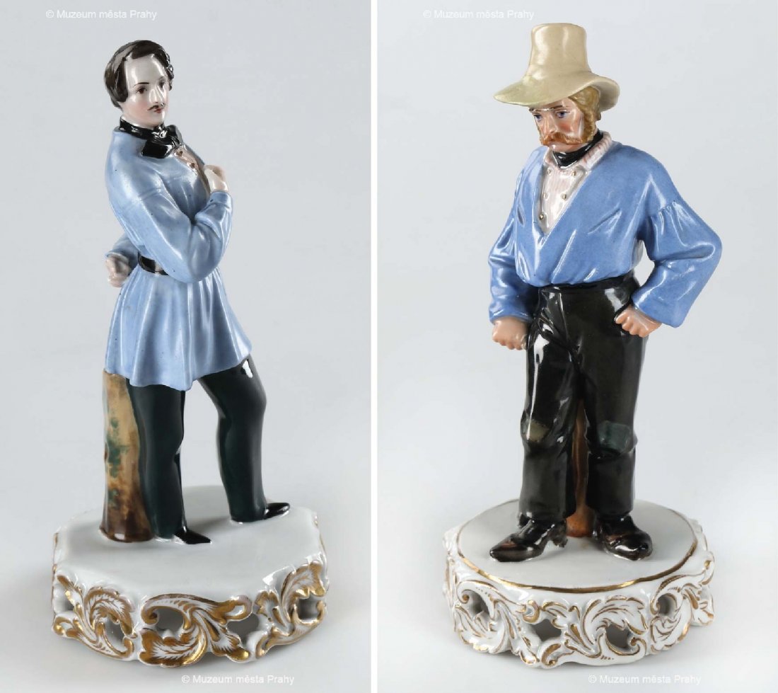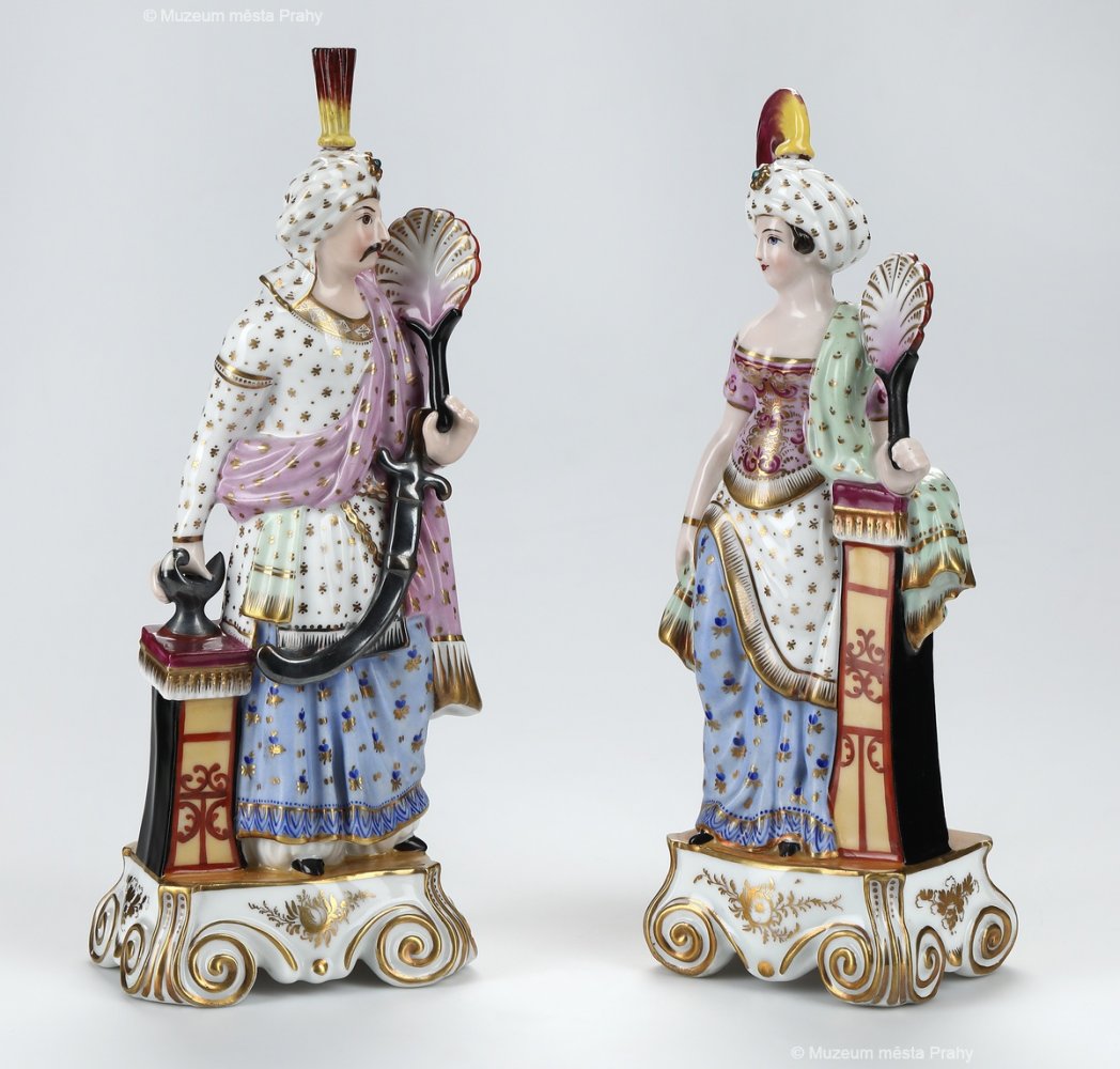 Orientálci (Peršané), 1845–1852, glazovaný, malovaný, zlacený porcelán, v. 26,3 a 24,7 cm, vyrobeno ve smíchovské porcelánce, značka výrobce K&C PRAG, sbírka MMP, inv. číslo H 022 901 a 902