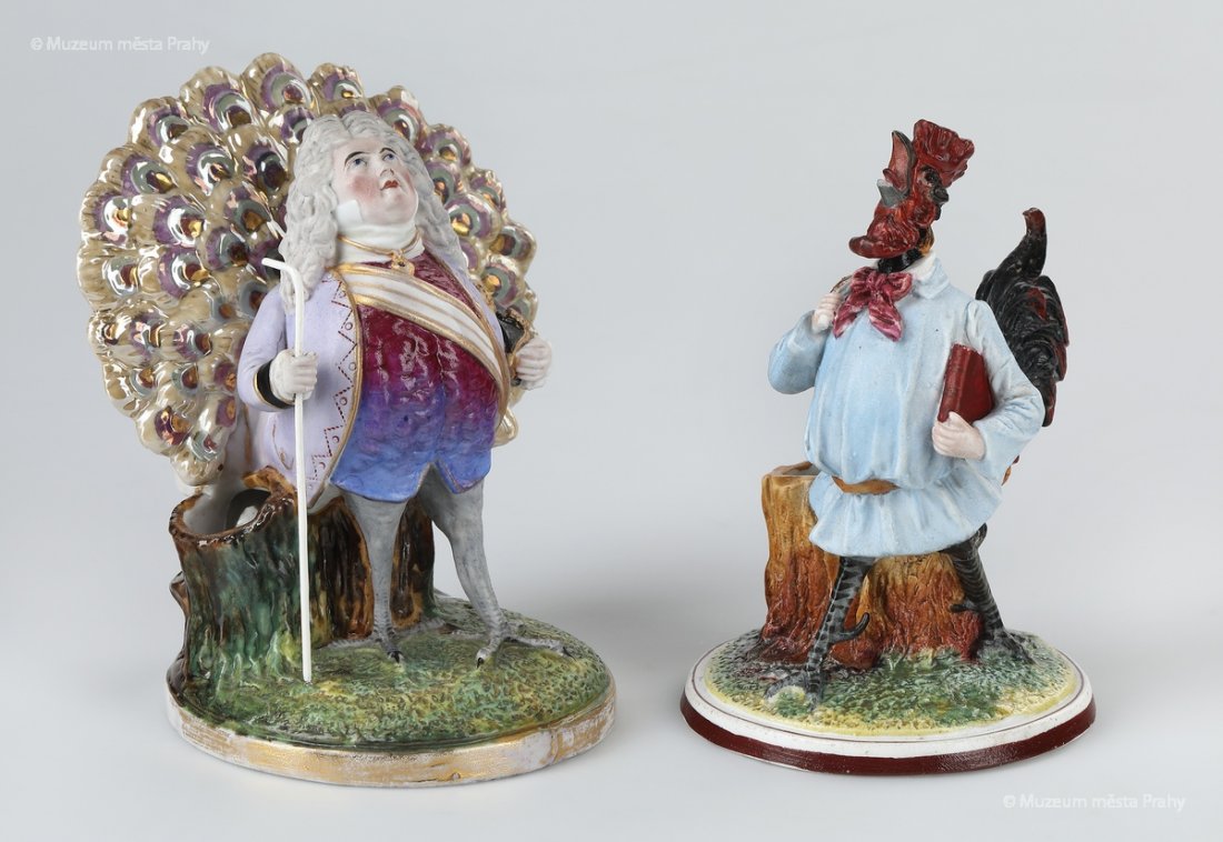 Ernst Popp: Karikatury Páv (Zpátečník) a Kohout (Radikál) – stojánky na doutníky, návrh 1848, provedení 1860, malovaný biskvit, v. 12,9 a 13 cm, vyrobeno ve smíchovské porcelánce, značka výrobce P a na 2. kusu Prag, sbírka MMP, inv. číslo H 020 422 a H 035 951