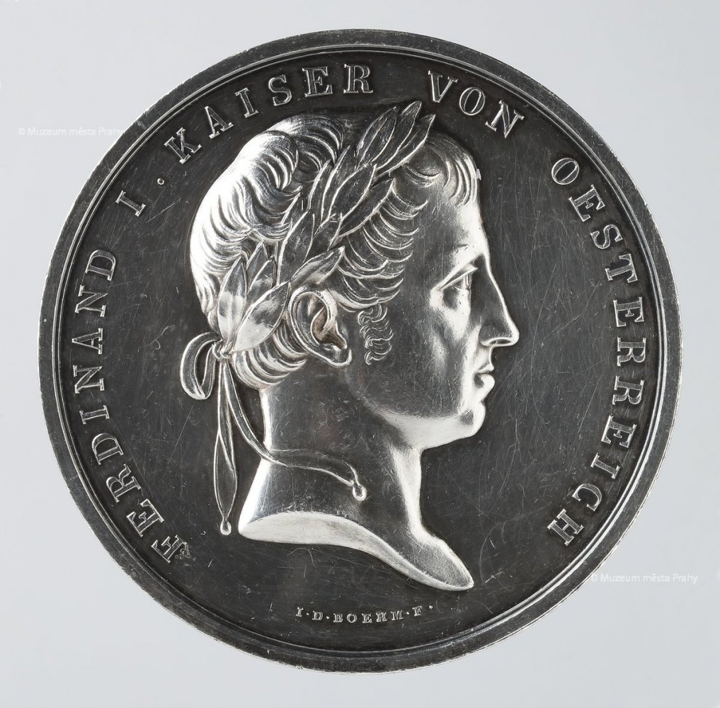 Josef Daniel Böhm: Medaile pro pražskou porcelánku Kriegel a spol. z Vlastenecké živnostenské výstavy ve Vídni, 1845, ražené stříbro, průměr 5,9 cm, avers: Poprsí císaře Ferdinanda I. z profilu, na hlavě vavřínový věnec, opis: FERDINAND I. KAISER VON OESTERREICH, signováno I. D. BOEHM. F., revers: Dubový věnec, uvnitř vyryto Kriegel et C. in Prag Porzellain, opis: DEM VATERLAENDISCHEN GEWERBFLEISSE AUSSTELLUNG MDCCCXXXXV, sbírka MMP, inv. číslo H 293 388