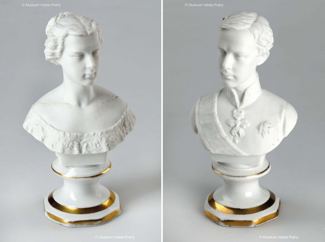 Ernst Popp: Portrét císařovny Elisabeth (Sissi) a císaře Franze Josefa I., kolem 1854, biskvit, částečně glazováno, zlaceno, v. 13,4 a 13,5 cm, vyrobeno ve smíchovské porcelánce, značka výrobce Prag, sbírka MMP, inv. číslo H 019 467 a 466