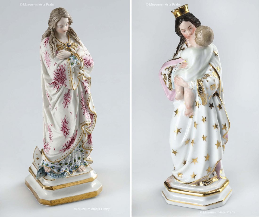 Ernst Popp: Panna Maria s Ježíškem, po 1852, malovaný biskvit, částečně glazovaný, zlacený, v. 18,6 cm, vyrobeno ve smíchovské porcelánce, značka výrobce Prag, sbírka MMP, inv. číslo H 020 340