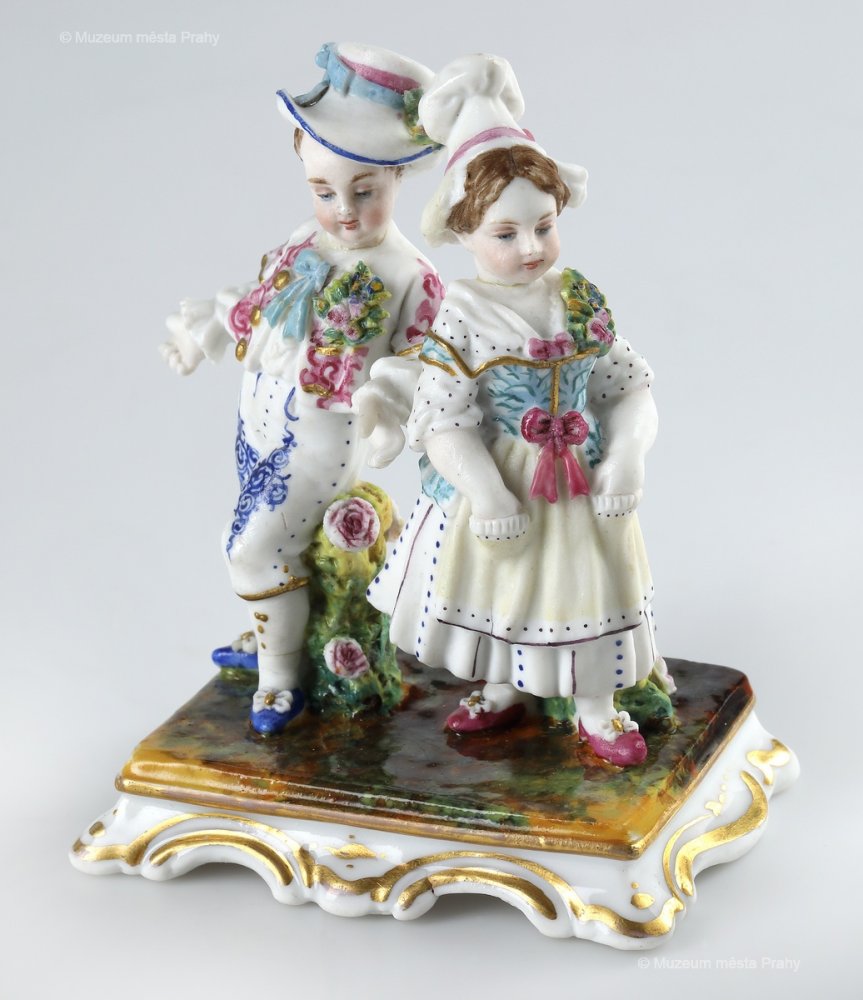 Ernst Popp: Dětský pár – Svatba, po 1852, malovaný biskvit, částečně glazovaný, zlacený, v. 9,6 cm, vyrobeno ve smíchovské porcelánce, neznačeno (pouze P tužkou), sbírka MMP, inv. číslo H 020 399