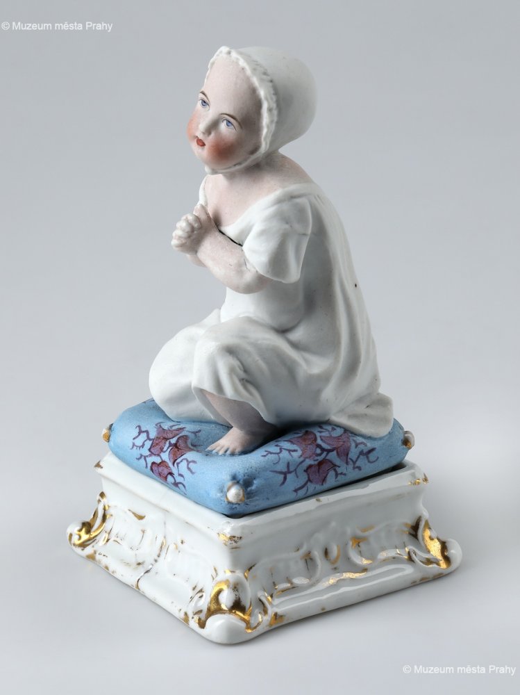 Ernst Popp (připsáno): Dóza Dětská modlitbička, po 1852, malovaný biskvit, částečně glazovaný, zlacený, v. 14 cm, vyrobeno ve smíchovské porcelánce, značka výrobce Prag, sbírka MMP, inv. číslo H 020 327