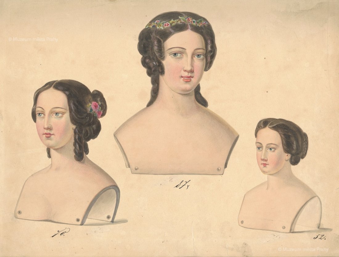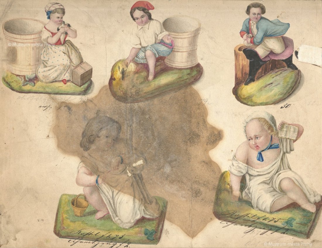 Listy ze vzorníku smíchovské porcelánky (nástolec s motivem šaška a hlavy panenek), po 1870, kolorované kresby na papíře, 29,5 × 22 a 23 × 30,5 cm, sbírka MMP, inv. číslo H 022 580/042 a 035