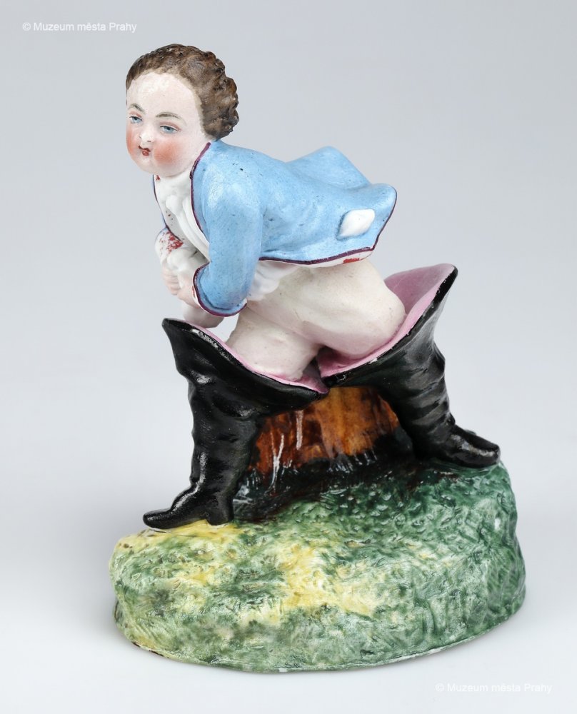 Paleček v sedmimílových botách, kolem 1870, malovaný biskvit, v. 9,3 cm, vyrobeno ve smíchovské porcelánce, značka výrobce Prag, sbírka MMP, inv. číslo H 020 366