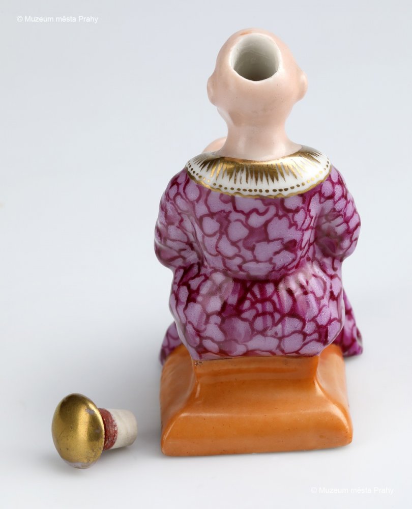 Flakón ve tvaru sedícího Číňana, 1842–1852, glazovaný, malovaný, zlacený porcelán, v. 10 cm, vyrobeno ve smíchovské porcelánce, značka výrobce K&C PRAG, sbírka MMP, inv. číslo H 020 326