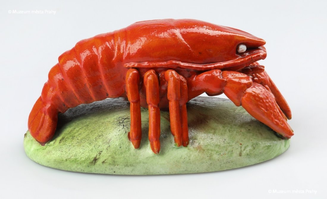 Těžítko ve tvaru raka, po 1852, malovaný biskvit, š. 12 cm, vyrobeno ve smíchovské porcelánce, značka výrobce Prag, sbírka MMP, inv. číslo H 086 736
