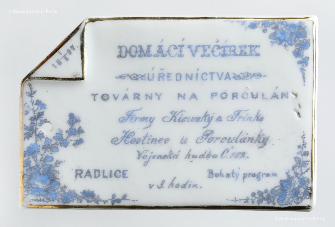 Visačka na Domácí večírek úřednictva továrny na porculán firmy Kiowský & Trinks, 1897, hostinec U Porculánky, Radlice č. 102, vojenská hudba, bohatý program, 18 1/2 97, v 3 hodin, glazovaný porcelán s potiskem, zlacený, 12 x 7,8 cm, vyrobeno v radlické porcelánce, značka výrobce K&T Prague, sbírka MMP, inv. číslo H 037 691