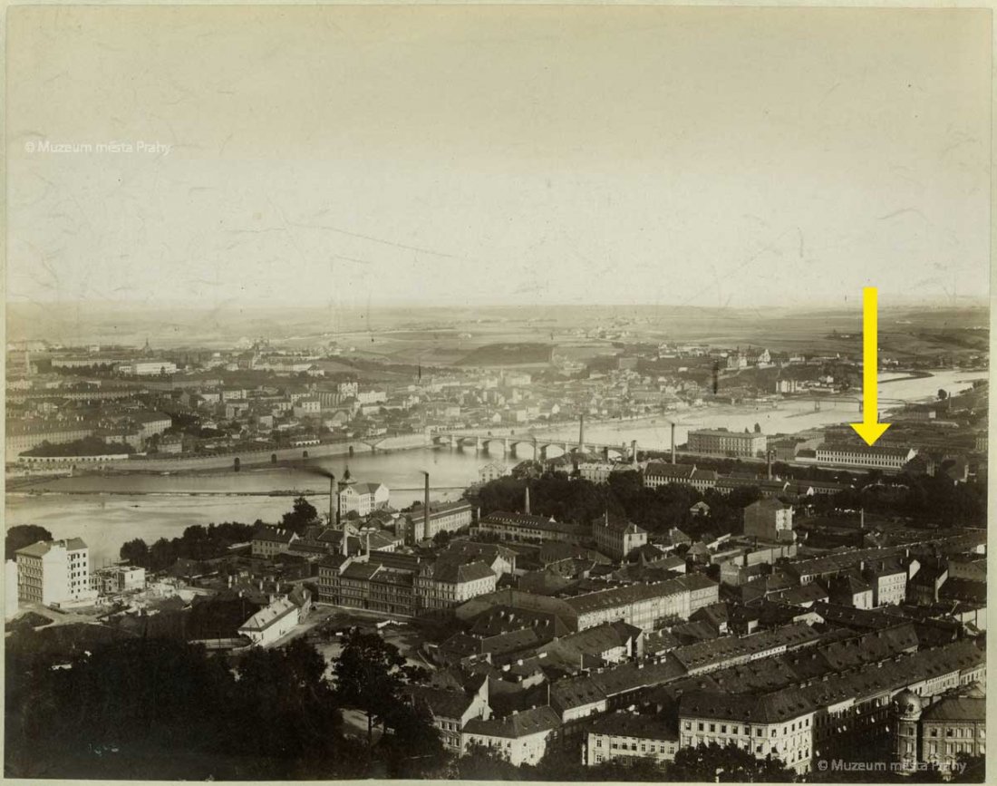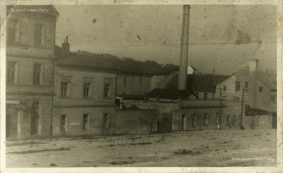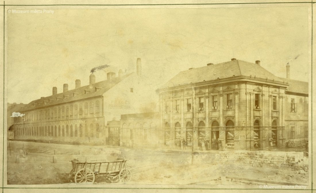 Továrna ležela v nebezpečné oblasti poblíž řeky Vltavy, což přineslo své následky za katastrofálních povodní roku 1890. Nic na tom nemění skutečnost, že snímek s dvěma muži na prámu – v pozadí s panoramatem Nového Města (vlevo s Palackého mostem) – působí poklidně, až romanticky.