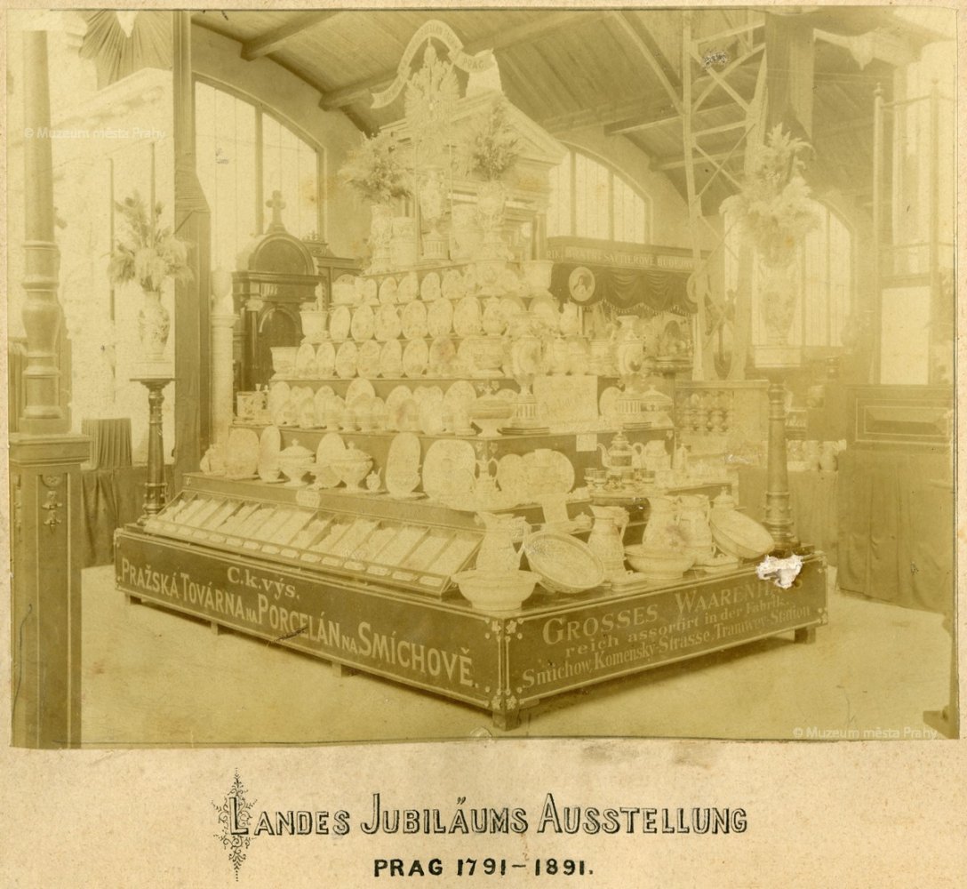 Fotografie expozice smíchovské porcelánky na Všeobecné zemské (tzv. Jubilejní) výstavě, 1891, 16,9 × 22 cm, sbírka MMP, inv. číslo H 033 797