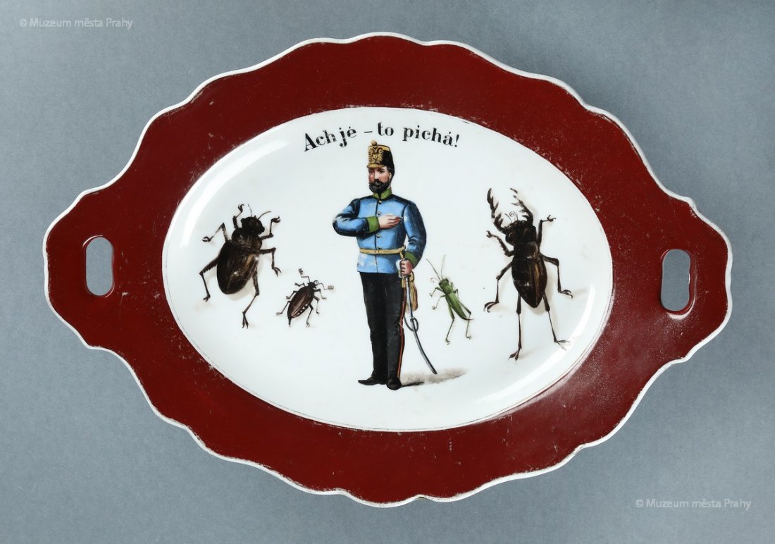 Podnos Ach jé – to pichá!, před 1894, glazovaný, malovaný porcelán, š. 39 cm, vyrobeno ve smíchovské porcelánce, značka výrobce Prag, sbírka MMP, inv. číslo H 038 829