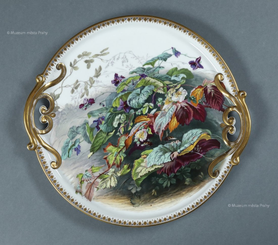 Dortový tác s motivem violek a ostružiníku, 60. léta 19. století, glazovaný, malovaný a zlacený porcelán, průměr 38 cm, vyrobeno ve smíchovské porcelánce, značka výrobce Prag, sbírka MMP, inv. číslo H 337 028, zakoupeno 2020.