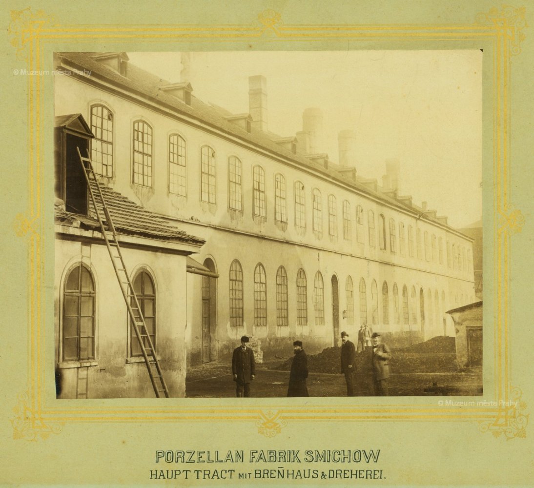 Tato skupinová fotografie bezpochyby vznikla na dvoře smíchovské porcelánky. Nápis na ceduli praví: C. K. výs. Pražská továrna na porculán v Smíchově. Odbor malířský. Pozornost zasluhuje, že se mezi mistry malíři, jejich pomocníky a učedníky nachází minimum žen, s nimiž si v pozdější době běžně spojujeme tuto vysoce řemeslně specializovanou, jemnou práci vykonávanou v porcelánkách.