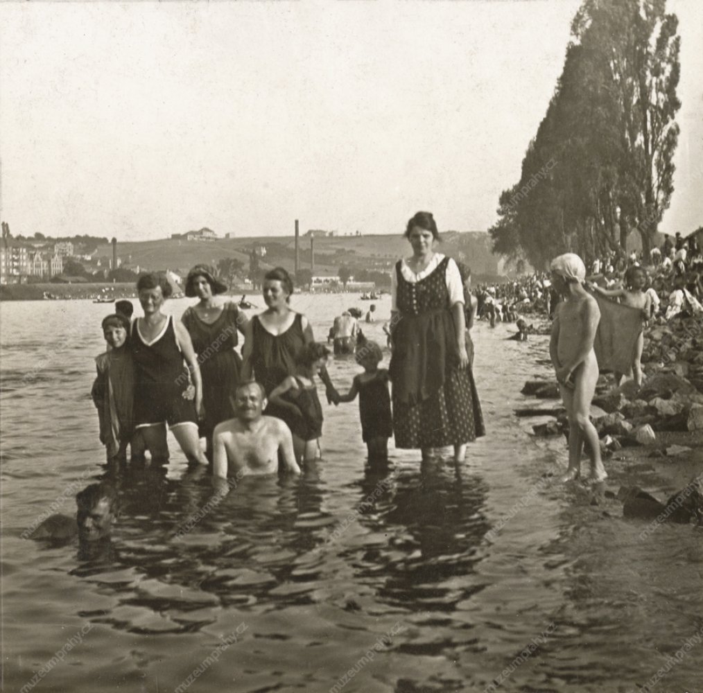 Na tomto snímku z letní Císařské louky upoutají zejména „mravné" koupací úbory žen. Snímek neznámého autora, kolem 1914, MMP H 336 985.