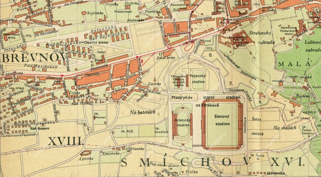 Území strahovského hřebene s vyznačenými sportovišti. Podrobný plán hlavního města Praha – výřez, Melantrich 1948, MMP KN 10536/019.